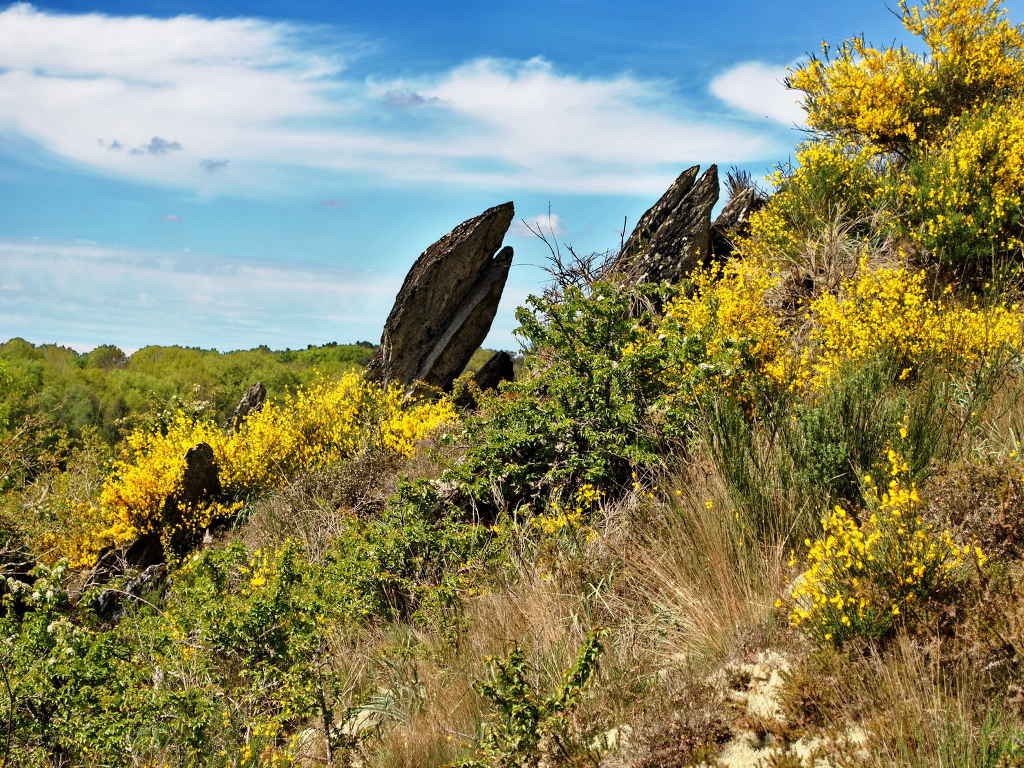 Nous traversons de magnifiques paysages de schiste, de granit et d’anciennes carrières ardoisières, violemment colorés du jaune des ajoncs et des genets en pleine floraison.