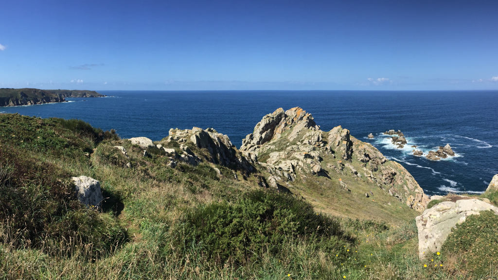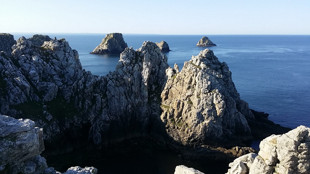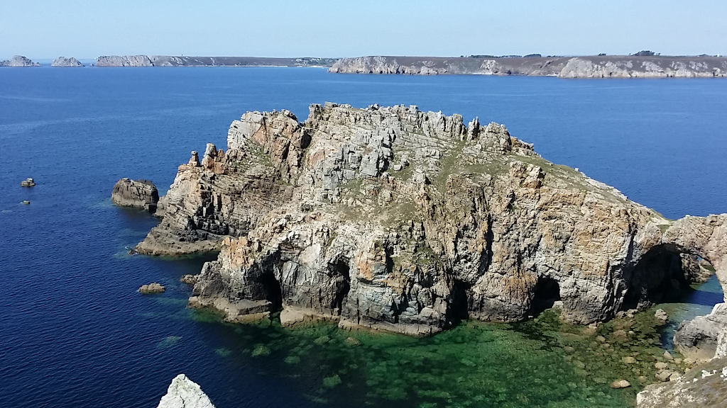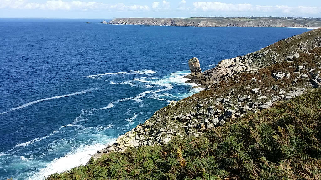 Nous progressons à travers quelques blockhaus, dont un transformé en musée avec devant de grosses ancres de bateau échoué sur ces côtes. La roche est blanche et très découpée. En mer, un rocher est percé d’une arche très photogénique. Puis nous arrivons à la pointe de Pen Hir où nous pouvons admirer les tas de pois qui sont trois gros rochers pointus en prolongement de cette pointe.