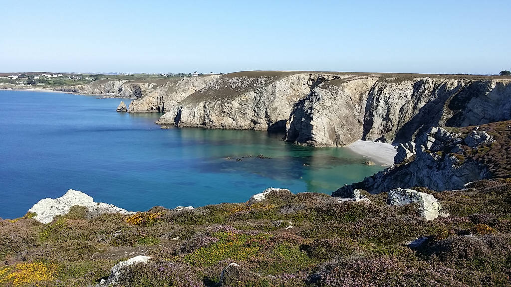 Départ de rando à 9h30 en passant par un château en ruine dont on imagine aisément le rêve que ça devait être car immédiatement tout le monde est émerveillé par la vision du puissant paysage qui s’offre à nous. En face la pointe du Toulinguet où se trouve une fortification militaire, ensuite une belle plage et à nos pieds une haute falaise.