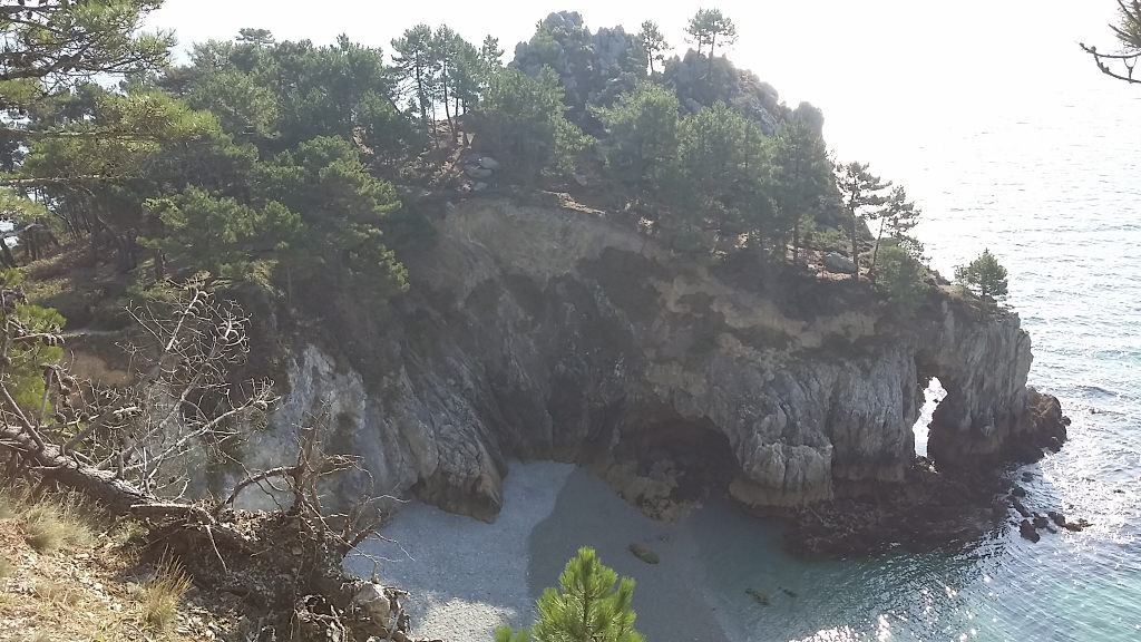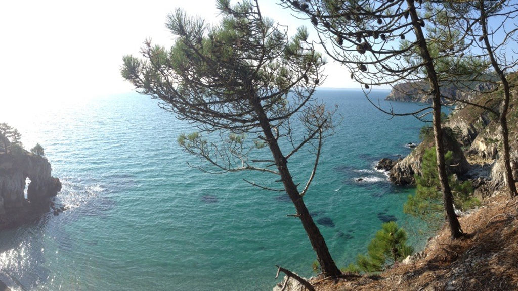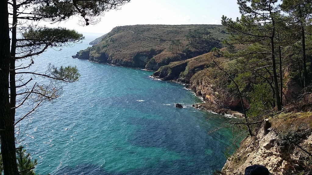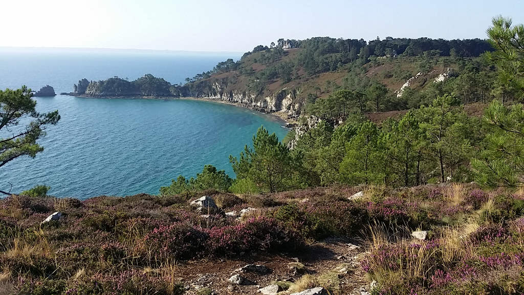 Nous avons un invité, Olivier, adhérent de l’ANF (Association Naturiste Finistérienne). Attendu à Morgat, il est récupéré in extrémis au parking de la plage. Nous partons donc vers le sud, le paysage est totalement différent de celui de la journée précédente. Nous avançons à travers une forêt bordant une mer turquoise, on pourrait se croire en Corse !