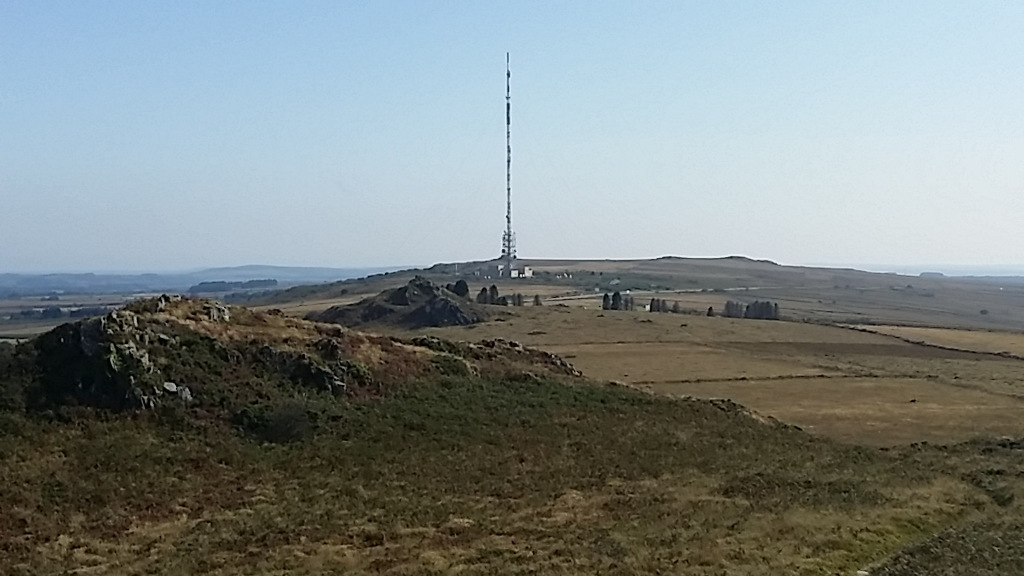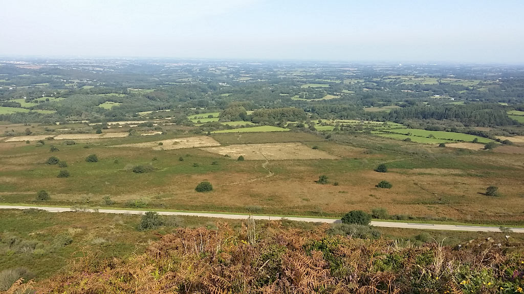 Nous passons au pied de Roc'h Trédudon, sur lequel se trouvent les antennes télé desservant une grande partie de la Bretagne. Deux traversées de route, et nous sommes au sommet du Roc'h Trevezel. La vue est superbe sur les communes environnantes telles que Sizun et Guimiliau, ainsi que sur le site nucléaire de Brennilis et le Réservoir de Saint-Michel (lac jouxtant la centrale). Des textiles sont à coté de nous, mais nous tenons bon, pas de rhabillage !