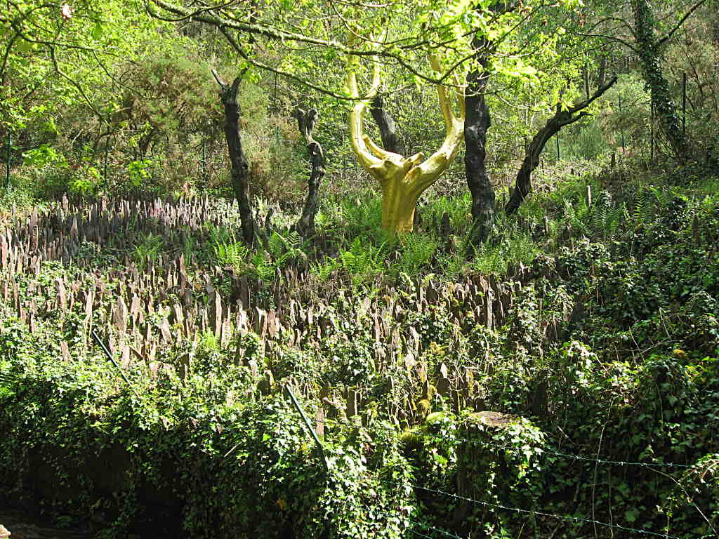 C’est donc un groupe de 16 personnes (dont 3 femmes) qui s’élance du parking du Val sans retour, antre de la fée Morgane, sœur du roi Arthur, pour une première halte à l’Arbre d’or. Le confort incomparable de randonner sans sac à dos a d’emblée été apprécié dans la sévère descente menant au célèbre Arbre d’or (un châtaigner calciné, doré à l’or fin après l’incendie de 1990 qui a ravagé près de 400 ha de la forêt de Brocéliande). S’il est cerné par des randonneurs et une nuée d’enfants en sortie scolaire, la fréquentation s’estompe en s’en éloignant, permettant rapidement de randonner nu … pour les moins frileux.