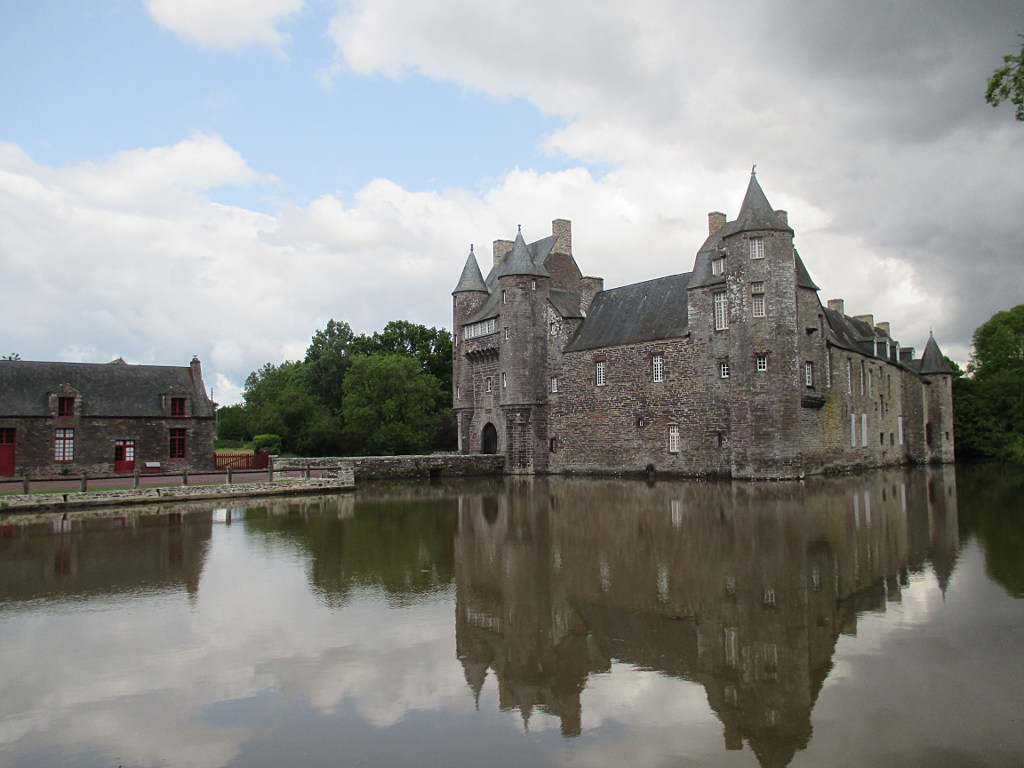 Poursuite du périple avec une innovation (involontaire même s’il s’en défend) de Pierre-Yves, sans doute lassé de faire ce circuit en boucle dans les deux sens, par un tour en 8, pour, la faim se faisant sentir, tous se poser au superbe château de Trécesson (forteresse médiévale du 15ème siècle). Assis sur le muret enjambant le plan d’eau où il se reflète, c’est, face au château hanté et dos à son pigeonnier, que le groupe se restaure, sous les timides apparitions du soleil. Sans avoir surpris la dame blanche qui hante le parc du château où elle fut sauvagement assassinée, le groupe, délesté de ses sacs à dos, reprend ses pérégrinations.