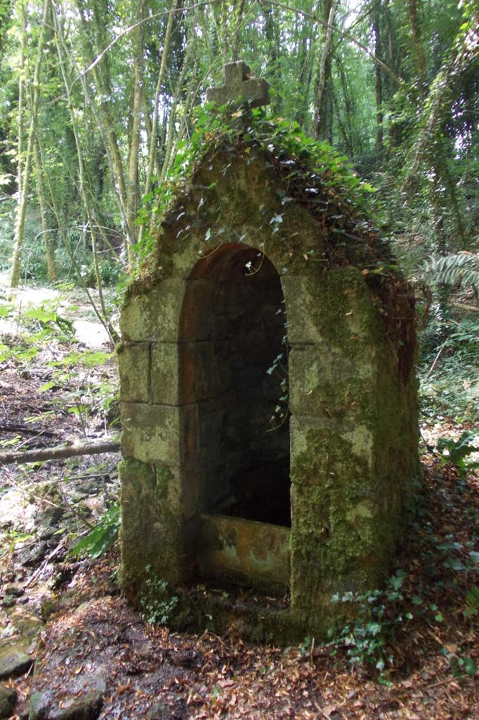 Nous reprenons notre chemin vers 13h00, toujours le long de notre cours d'eau, nous recherchons le gué pour passer de l'autre coté impossible de le retrouver, alors à l'aide de quelques pierres plates nous en fabriquons un et voila nous sommes de l'autre coté et nous découvrons une fontaine perdue dans les bois.