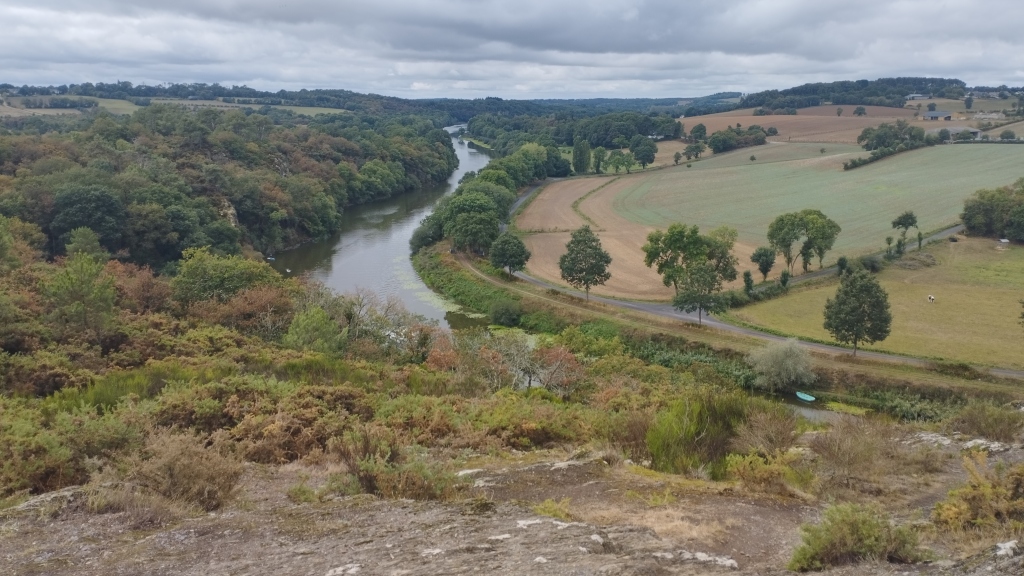 En attendant que tout le monde soit arrivé nous nous sommes retrouvés à 5 pour prendre un café. Puis nous nous sommes rendus en voiture au pied du viaduc de la Corbinière où nous avons garé nos véhicules. Aprés s'être mis en tenue avec quand même quelques capuches ,nous avons commencé notre rando en s'enfonçant dans les bois humides. Un large chemin en pente douce nous a conduit tout doucement vers la falaise dominant la Vilaine. Trés vite le crachin s'est arrêté et nous nous sommes tous retrouvés en tenue de peau. De ce sous bois émanait une trés agréable odeur de pin, fougères et bruyères mouillés, et cela nous a conforté dans l'idée que nous avions bien fait de ne pas céder au découragement face à une météo trés défavorable et rébarbative au départ. Nous avons poursuivi notre ascension et avons découvert une grotte creusée au 18ième siècle par un ermite en quête de solitude. Aprés quelques photos d'usage nous nous sommes approchés de la falaise aprés s'être rhabillés puisque 1 monsieur et ses 2 garçons étaient déja présents sur le site. Ce qui ne nous a pas empêché de profiter du haut de notre promontoire schisteux de la beauté de ce paysage avec comme toile de fond le cheminement de la Vilaine au fond de la vallée. Nous avons repris notre randonue toujours en tenue de peau puisque la pluie a laissé place à une belle luminosité et une douce chaleur ce qui n'était pas pour nous déplaire.