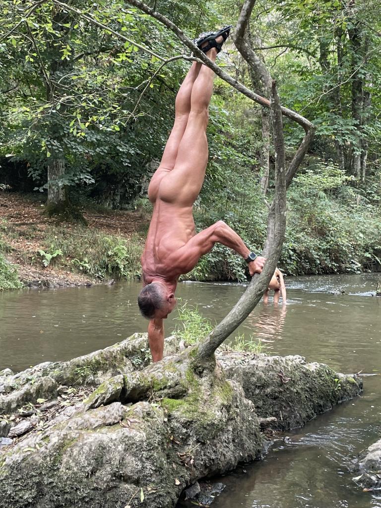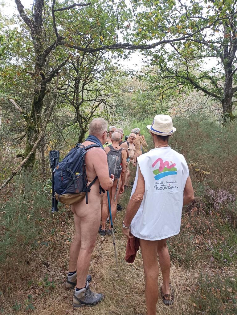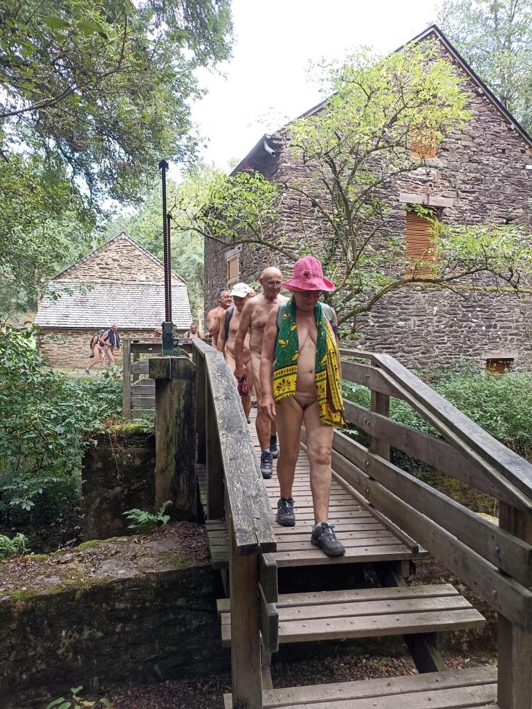 Pique nique sous le soleil dans un champs, joli passage en hauteur, puis à proximité du moulin une partie du groupe ne résiste pas à une baignade dans le ruisseau que nous venons de longer. Interviews et séances de tournage s'enchainent, une photo de dégradé de bronzage déjà fait en 2017 au même endroit est organisée et par Christian L puis nous ascensionons notre dernière falaise de schiste violet agrémenté de jolies mousses de différentes couleurs; la vue aérienne que nous procure cette vue est vraiment belle et inspire le caméraman qui filme avec le drone tout le groupe qui s'égosille à crier «le naturisme c'est l'aventure».