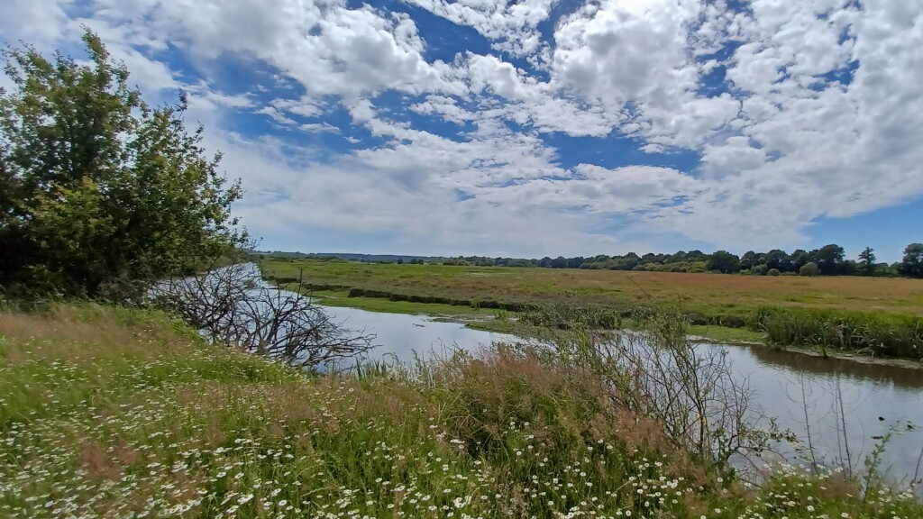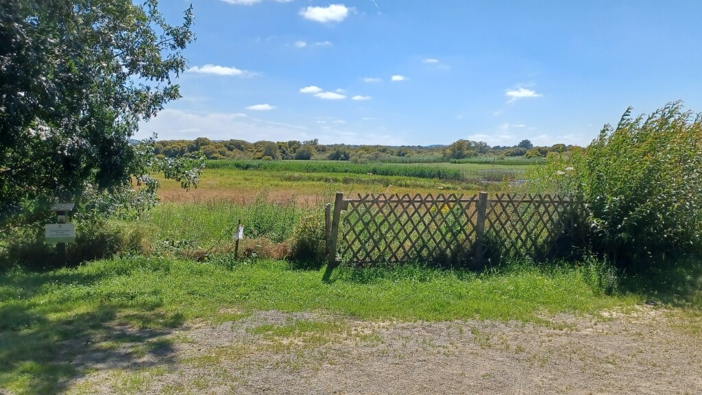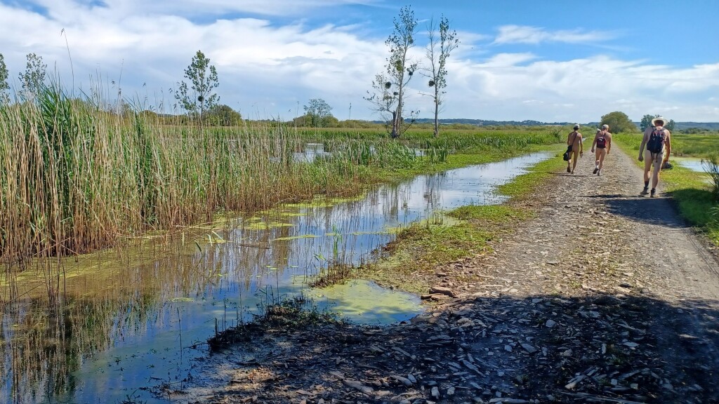 On a quitté le chemin principal juste avant quelques habitations afin de passer sur une longue passerelle au-dessus du marais. Par la suite il y avait un tronçon tout près d'une route, heureusement peu fréquentée, et on a aussi fait un petit détour pour voir un "mur d'observation" avec des fenêtres par lesquelles on pouvait observer les oiseaux sans les perturber. Sauf que des oiseaux, il n'y en avait pas.