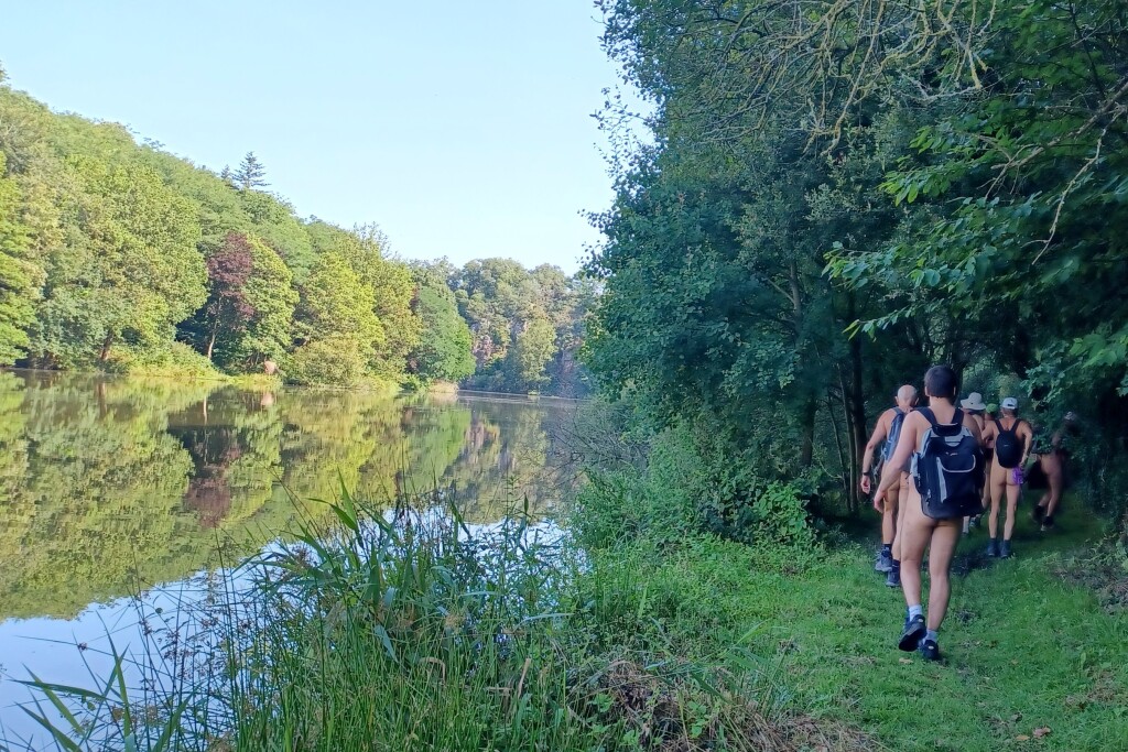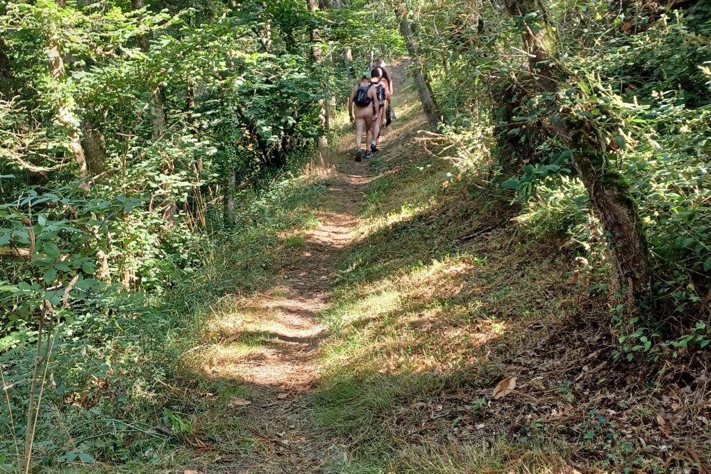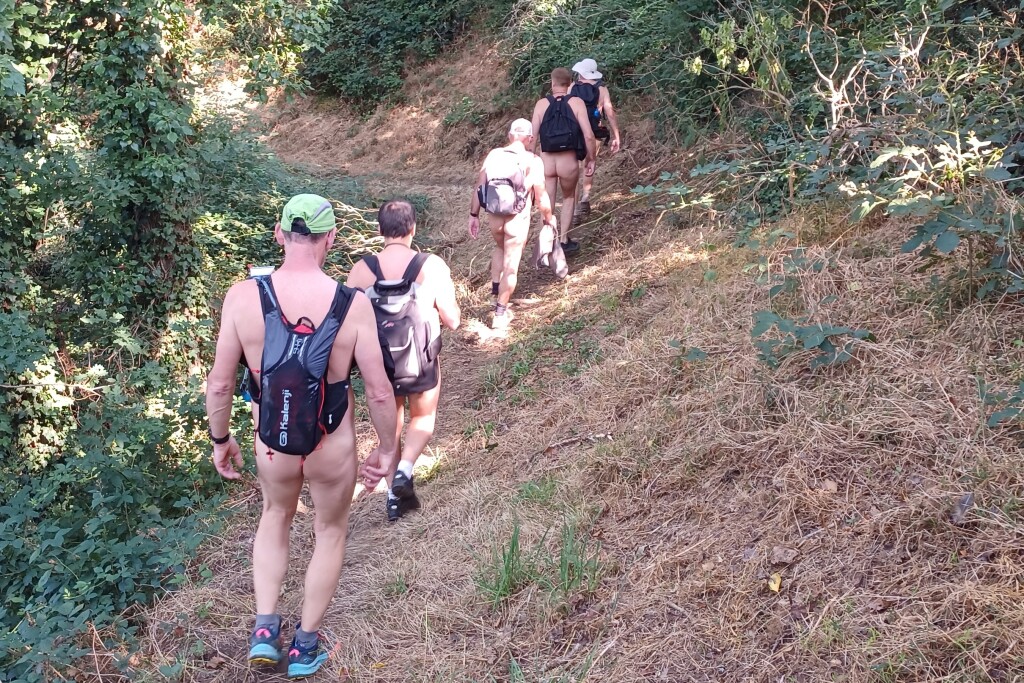 On a croisé une femme avec son chien et un enfant en début de rando, on les a croisés à couvert, puis quelques kilomètres plus loin dans les sentiers en serpentin, on a été pris de court par une joggeuse, qui avait l'air ouverte d'esprit en disant "bonjour, il fait bon, vous devez être bien nus!". On a juste eu le temps de se couvrir pour la deuxième qui avait sans doute plus de mal à suivre.