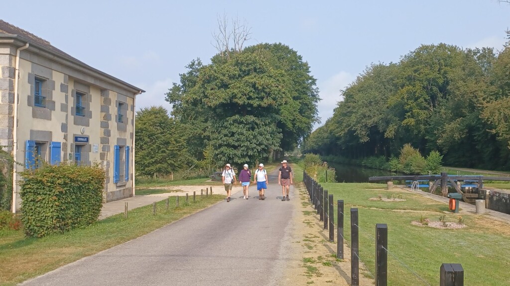 Nous avons rendez-vous au parking qui borde le canal d’Ile-et-Rance et tout le monde est à l’appel, soit 12 présents. Nous longeons le canal sur une berge pour revenir sur l’autre, en face, après avoir franchi un pont. Arrêt pour une photo de groupe. Deux belles maisons éclusières dont l’une transformée en gîte viennent agrémenter le parcours.