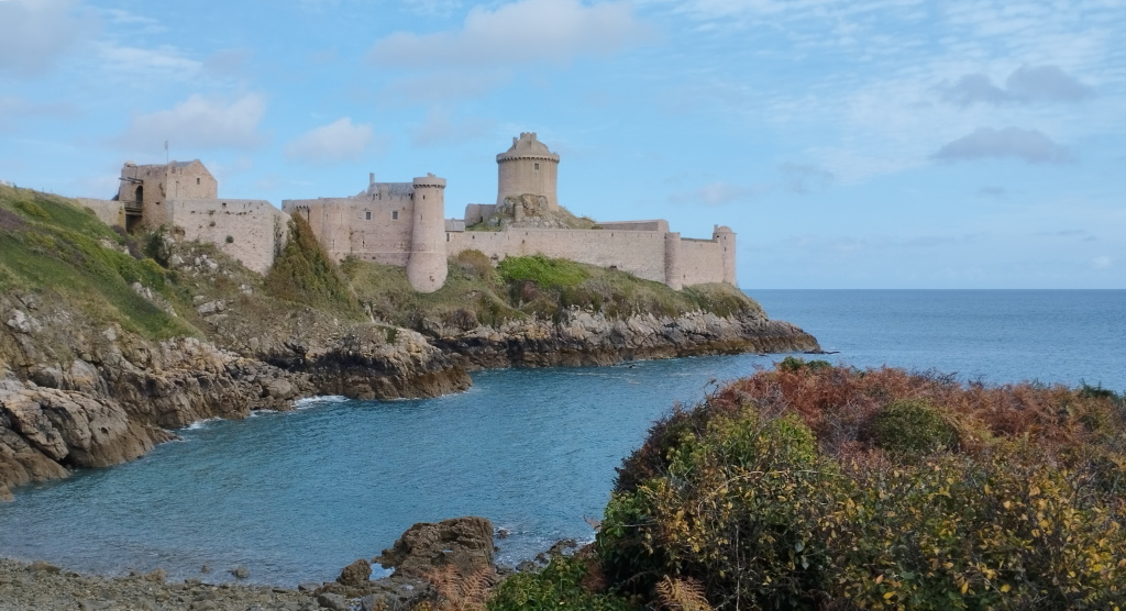 Je prends congé de Jean-Yves, et je le remercie chaleureusement, sans lui la plus belle partie de la rando n'aurait pas été possible. Je continue mon chemin habillé, les visiteurs deviennent de plus en plus rares. Ici aussi on est dans les landes, mais plus loin de la route. Et une fois passé le dernier accès au parking, il n'y a plus que quelques randonneurs. La vue est sublime: la mer et les falaises d'un côté, le Cap Fréhel derrière et le Fort La Latte devant. Il reste le petit vent qui rend la nudité désagréable.