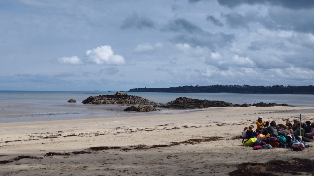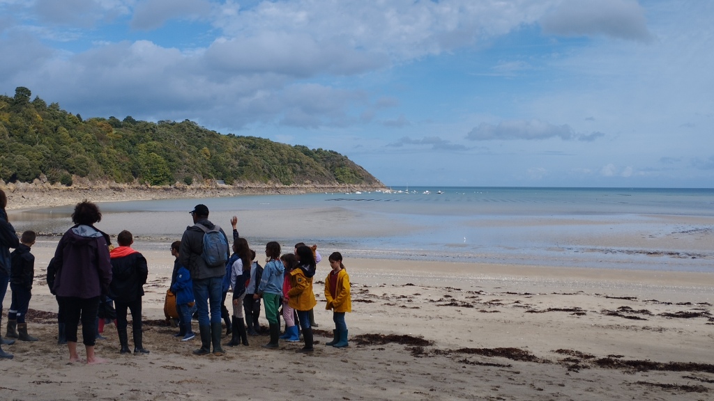 J'arrive à la plage de Château Serein dans l'espoir d'y pouvoir faire une petite sieste, "complètement nu au soleil" comme chantait l'autre, mais c'est un peu compromis: il n'y a pas une mais deux classes d'enfants accompagnés installées sur la plage pour apprendre tout sur les marées. Qu'à cela ne tienne, je trouve bien un coin hors de leur vue, derrière les rochers. Sauf que là c'est les engins des mytiliculteurs qui commencent à se pointer. Tant pis, je continue.