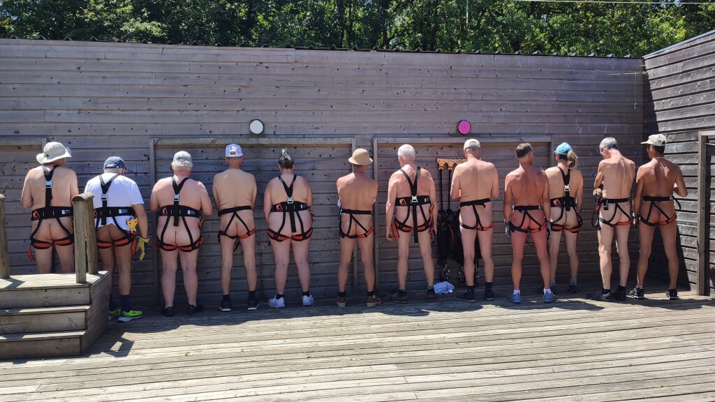 Nous voilà équipés, comme disent certains, comme les danseuses du Crazy Horse. C'est vrai que ça fait un peu bizarre. Il y a deux types de baudrier, avec et sans bretelles, et on a l'impression que ceux avec bretelles sont un peu plus comfortables sur un corps nu que les autres, mais quoi qu'il en soit ça se passe très bien, pas besoin de se protéger par un T-shirt, sauf peut-être pour les tyroliennes dites "rapides", mais personnellement je n'étais pas de ce côté-là.