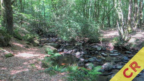 La première partie de la rando suivait le tracé de la GR37 le long de l'Aff, dans une forêt bien humide avec un ruisseau quasiment à sec. Le résultat était un sentier assez glissant par endroits et une profusion de champignons partout. On a vu une poignée de gens qui en ramassaient, mais autrement le sentier était tout à fait calme.